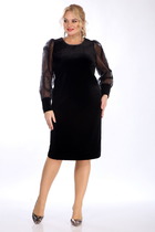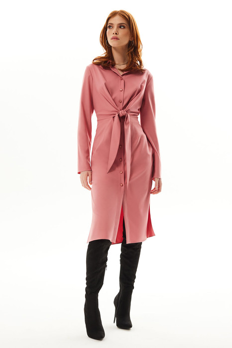 Платье с центральной застежкой на петли и пуговицы, втачным воротником с отрезной стойкой. Платье отрезное по линии талии Полочки с драпировкой, переходящей в завязки по талии. Нижняя часть платья с талиевыми вытачками. Спинка со средним швом, талиевыми вытачками. В боковых швах расположены карманы. Разрезы в боковых швах. Рукав втачной, длинный.