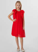 Платье коктейльное для девочки А-образного силуэта, средней длины, с втачными короткими рукавами, круглым вырезом горловины. Застёжка сзади на навесную петлю с пуговицей. Ткань- кружевное полотно на подкладке из кулирного полотна.