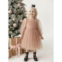 Платье для девочки А-образного силуэта, средней длины, с длинными втачными рукавами, с круглым вырезом горловины, отрезное по линии талии. Перед расшит пайетками. Юбка платья двухслойная, верхний слой юбки из сетки присборен.