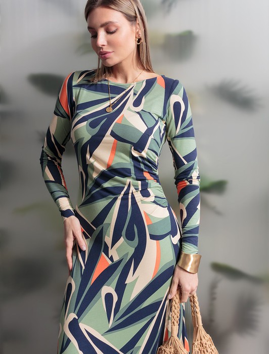 Состав: 95%Вис 5%ПУ Параметры модели на первом фото: Рост 170, бюст 89, талия 63, бедра 92Платье длины миди сшито из трикотажной вискозы с эластаном. Идеально садится по фигуре, обеспечивая не только комфорт, но и уверенность в себе. Модель подчеркивает линию талии и женственные изгибы фигуры. А геометрический принт скрывает любые неровности. Совет стилиста: универсальная модель для праздничного выхода или повседневного образа. Носите в тандеме с кожаной курткой и высокими сапогами. Со свободным жилетом крупной вязки.