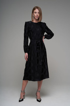 Платье женское прямого силуэта из плательной ткани. Горловина круглой формы. По переду рельефы, отрезное по талии, по юбке элемент запаха. По спинке средний шов, по горловине разрез с застежкой на потайную петлю и пуговицу. Отделка в виде окантовки горловины, низа рукавов, отлетных деталей юбки. В  съемный пояс с зажимами на концах.