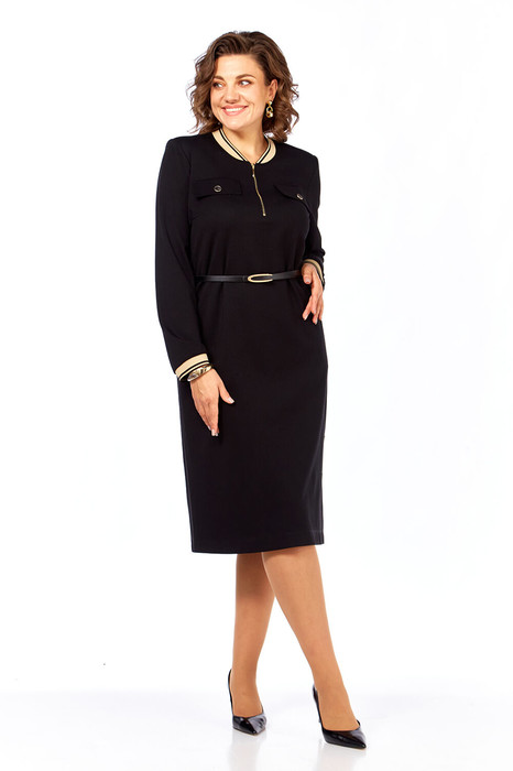 Платье женское, прямого силуэта, выполнено из трикотажного полотна. Горловина и низ рукавов обработаны декоративным довязом. Застежка на тесьму-молнию. По переду нагрудные вытачки и клапаны. По боковому шву шлица, декорирована пуговицами. Спинка со средним швом. Рукава втачные, длинные. В комплекте ремень.