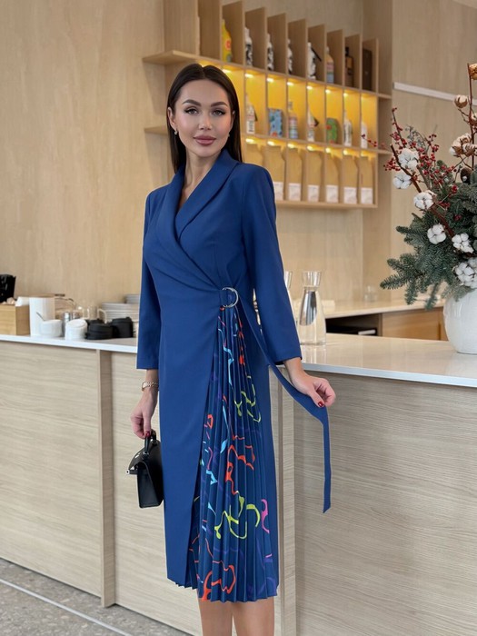 Платье женское из двух видов ткани, полуприлегающего силуэта. Перед комбинированный на запах с поясом. По переду нагрудные и талиевые вытачки. Горловина обработана воротником шалевого типа. Передняя половина юбки выполнена из ткани-компаньона с радиальным гофрированием. В боковом шве справа потайная молния. В области талии слева расположен притачной пояс из основной ткани, завязывающийся на полукольца. Спинка цельнокроеная с плечевыми и талиевыми вытачками. Рукав 7/8 втачной одношовный. Цвет материала может отличаться по тону в зависимости от настроек вашего монитора!