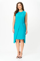 Платье женское из двух видов ткани, полуприлегающего силуэта. Перед комбинированный на запах с поясом. По переду нагрудные и талиевые вытачки. Горловина обработана воротником шалевого типа. Передняя половина юбки выполнена из ткани-компаньона с радиальным гофрированием. В боковом шве справа потайная молния. В области талии слева расположен притачной пояс из основной ткани, завязывающийся на полукольца. Спинка цельнокроеная с плечевыми и талиевыми вытачками. Рукав 7/8 втачной одношовный.