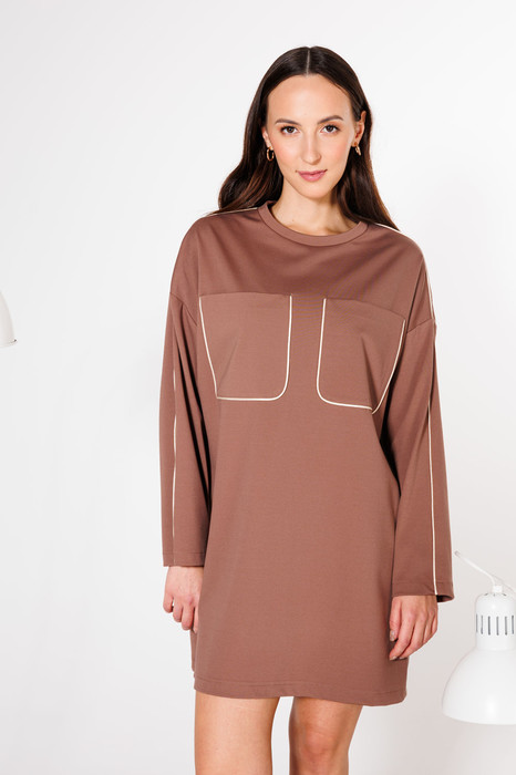 Свободное платье с контрастной мерцающей отделкой — одна из самых уютных моделей для повседневного гардероба и отличная пара для повседневных образов. Мы выбрали для него плотный трикотаж нежного шоколадного оттенка, и молочный атласный кант для отделки. Длина - 80 см.
