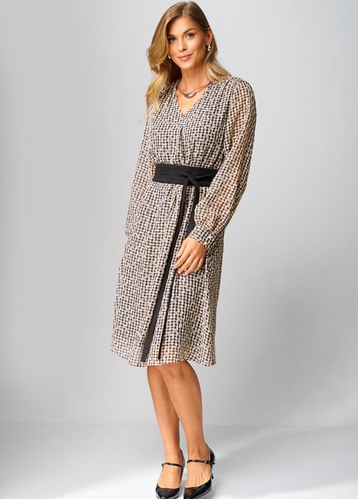 Платье женское, повседневное, на подкладке,свободного силуэта, расширенное книзу, длиной ниже коленей, с втачными рукавами, со съемным поясом. Вырез горловины детали переда платья «V-образной» формы, по центру обработана складка. По плечевым швам обработана сборка. Рукава втачные одношовные, с притачными манжетами, с застежкой на 2 петли и 2 пуговицы. Разрезы обработаны окантовкой, по швам притачивания обработана сборка. Платье: длина рукава - 61см, ширина рукава – 21см, длина спинки – 107см.