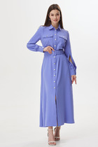 Платье женское, повседневное, на подкладке,свободного силуэта, расширенное книзу, длиной ниже коленей, с втачными рукавами, со съемным поясом. Вырез горловины детали переда платья «V-образной» формы, по центру обработана складка. По плечевым швам обработана сборка. Рукава втачные одношовные, с притачными манжетами, с застежкой на 2 петли и 2 пуговицы. Разрезы обработаны окантовкой, по швам притачивания обработана сборка. Платье: длина рукава - 61см, ширина рукава – 21см, длина спинки – 107см.