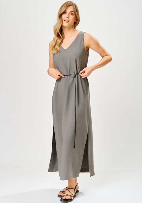 Платье женское из вискозной ткани, полуприлегающего силуэта,прямое книзу, длиной до середины икр, в боковых швах обработаны разрезы, со съемным поясом из декоративной тесьмы. Деталь переда платья с нагрудными вытачками. Вырез горловины – «V-образной» формы. Платье: длинасередины спинки – 130см.