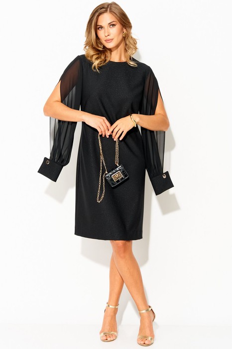 Вырез горловины округлой формы, застежка на потайную тесьму-молнию в среднем шве спинки. Деталь переда с нагрудными вытачками. Деталь спинки со средним швом и талиевыми вытачками. Рукава втачные из отделочной ткани, с вертикальным разрезом по центру. Рукава с притачными манжетами с застежкой на 1 петлю и пуговицу, по шву соединения обработана сборка.