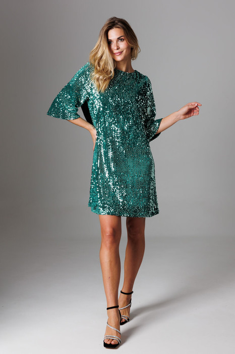 Элегантное платье А-силуэта из мягкого трикотажного полотна велюр с пайетками и текстильными лентами на спинке, которые завязываются в эффектный бант.