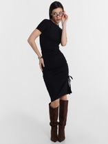 Спинка с цельнокроеным укороченным рукавом «летучая мышь» имеет средний шов, в котором расположен у горловины разрез с пуговицей-застежкой. Юбка платья А-силуэта, состоящая из цельной детали спереди, сзади: средний шов. В боковых швах платья: внутренние карманы. Лиф платья с юбкой платья соединен швом, в который вставлена эластичная тесьма шириной 1 см. Юбка платья на подкладке. Длина платья по среднему шву спинки 113-115см (в зависимости от размерного ряда). Длина юбки платья от линии талии 78-82 см. Платье дополнено съемным текстильным поясом на пряжке.