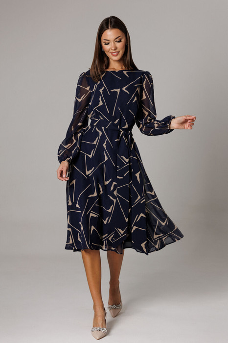 Элегантное платье, отрезное по линии талии из воздушного шифона на подкладке. В верхней части изделия расположены нагрудные горизонтальные вытачки, по спинке и полочке: вертикальные талиевые. Линия горловины оформлена в форме «лодочка». Нижняя часть платья по крою: «полусолнце». В среднем шве спинке потайная застежка-молния. Рукав втачной, одношовный. По окату и низу рукава-сборка. Длина платья по спинке 111 см. Длина рукава 62 см.