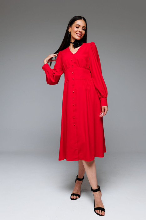 Воздушное элегантное платье. Изделие состоит из отрезного лифа, спереди со складками по линии груди, по спинке - сборка. Юбка изделия имеет расклешение к низу, по талии фрагментами сборка. Лиф и юбку соединяют облегающие рельефные детали, имитирующие фигурный корсет, высотой от 7,5-12 см. Спереди платье на застежке: петли-пуговицы. Горловина имеет V-образный вырез. Рукав втачной, одношовный, с притачной манжетой. Длина рукава в готовом виде 65,5 см. По окату и низу рукава - сборка. Спереди платье имеет застежку на петли-пуговицы. Длина платья по спинке 112-115 см (согласно размерному ряду). Платье на трикотажной подкладке (лиф платья и юбка.)
