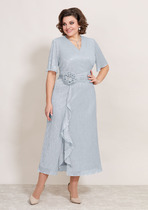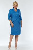 Платье лёгкое, струящееся на запахе. Отрезное по линии талии, расширенное к низу. Воротник выходящий из линии плеча, пиджачного типа, на участке воротника - декоративная перемычка создающая мягкую складку. Рукава одношевные с узкой резинкой по низу и сборкой по окату. Длина рукава до линии локтя. Застежка внешней части переда на потайную кнопку, внутренней части переда на завязку. В боковых швах карманы. Особенностью платья платья является обработка всех внутренних швов платья окантовкой, что придает изделию элитный вид.