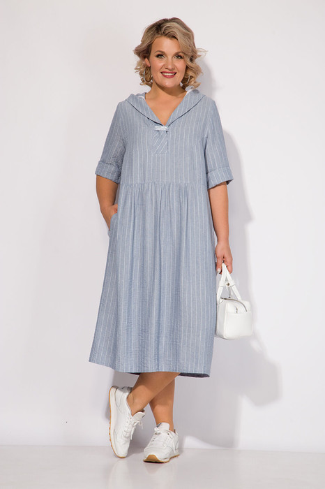 Эффектное летнее платье в полоску в стиле спорт-шик. Модель свободного силуэта отрезное по талии. Рукав вточной, укороченный с цельнокроеной манжетой.   V-образный вырез горловины переходит в свободный капюшон. По переду декоративная пата с печатью. В платье предусмотрены боковые карманы. Легкая сборка по переду и спине скроет все недостатки, подчеркивая Ваши достоинства. Легкое воздушное платье отличный вариант для жаркого летнего отдыха и весенней прогулки!