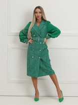 Платье выполнено из струящейся ткани с люрексом. Платье свободного силуэта. Горловина округлой формы обработана обтачкой. Рукав втачной, расклешённый к низу. По переду платья нагрудные выточки.