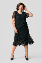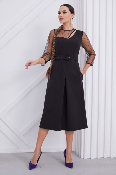 Платье с округлым вырезом горловины, отрезное по талии и съёмным поясом из ткани. Перед с кокеткой из сетки горохи флок и дизайнерским вырезом в верхней части. Нижняя часть переда со встречной складкой. Спинка с талиевыми вытачками и потайной молнией в среднем шве. Рукава втачные выполненные из сетки горохи флок. Изделие с карманами в боковых швах.