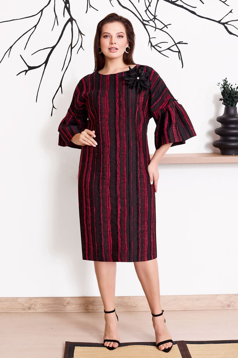 Эффектное платье футляр прямого силуэта   с дизайнерскими рукавами и  съемной брошью  ручной работы.   Платье  на основе цельнокроеного покроя  полуприлегающего силуэта с  округлым  вырезом выполнено из  крешованной  тафты с бархатными вплетениями, вертикальные полоски вытягивают силуэт и заужают фигуру.  Перед  оформлен нагрудными вытачками и украшен съемной брошью. Брошь цветок выполнена вручную из нежного шелк атласа с матовым блеском. Спинка со средним швом и талиевыми вытачками. Застежка на потайную молнию в среднем шве спинки, по низу разрез. Рукав на основе кимоно , с притачной деталью со встречными складками .