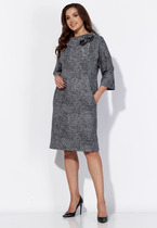 Платье с округлым вырезом горловины и фигурным низом. Изделие с кокеткой по переду и спинке. Перед с дизайнерскими фигурными отрезными деталями и пришивным декором в верхней части. Спинка с дизайнерскими фигурными деталями. Рукава втачные с отворотами и патами с пуговицами по низу. Платье с карманами в боковых швах.