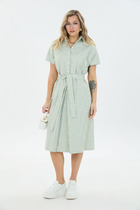 Платье умеренного объёма  со спущенной линией плеча длиной ниже колена. Застёжка по переду на петли и пуговицы переходящая в разрез. Воротник отложной. По талии съёмный эластичный пояс.