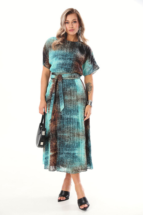 Платье из лёгкой ткани с ярким принтом. Застежка на потайную молнию по среднему шву спинки. В комплекте идет длинный съемный пояс. На юбке по линии талии заложены складки. Длина 128 см.