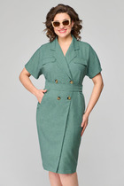 Платье полуприлегающего силуэта выполнено из хлопка в двух цветах: синий и голубой. Рукав втачной, по низу рукава манжета с застёжкой на петли/пуговицы. Воротник рубашечного кроя на стойке, застёжка по платью потайная на петли и пуговицы. По линии талии и юбке платья выполнены горизонтальные подрезы из отделочной ткани. В боковых швах карманы. По спинке: кокетка и две складки, в шов по талии вставлена резинка для удобства движения. К платью прилагается съёмный пояс с металлической пряжкой, с резинкой в области спинки для комфорта и удобства в носке.