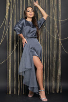 Платье свободного кроя, А силуэта. Рукав втачной на манжете. В Y-образный вырез горловины вшиты воланы. По горловине застежка на завязку.