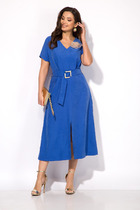 Платье А силуэта выполнено из экокожи, на подкладке. Рукав втачной короткий, округлый вырез горловины. По переду центральный шов и нагрудные вытачки. Застежка на потайную молнию в среднем шве спинки. Центральные, боковые швы и горловина декорированы металлическими зажимами.