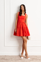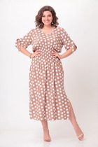 Платье выполнено из хлопковой ткани. Длина платья миди. В среднем шве спинки расположена застежка. Платье с отрезной талией. Рукав короткий. По спинке платья выполнены декоративные завязки на бант. Имеет сборку по талии, по всей длине юбки расположены декоративные пуговицы. По передней части платья расположены большие накладные карманы.