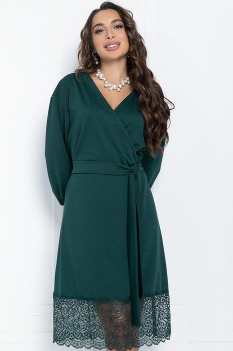 Летящее платье платье из трикотажа выглядит сдержано, но в то же время стильно и празднично. Изделие обладает акцентными элементами, которые придадут образу женственности. Элегантный вырез с имитацией запах подчеркнет зону декольте, по низу изделия широкое кружево, которое сделает акцент на ножках и визуально удлинит их. Рукав длинный со спущенным плечевым швом.