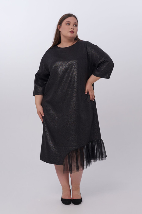 Эффектное платье прямого силуэта из ткани с метталическим напылением, которая добавляет изделию особую легкость. Горловина круглая, обтачная, без воротника, застежка на петлю-пуговицу. Рукав длинной 3/4 на спущенной линии плеча. Прилегание по груди за счет вытачек. Изюминкой модели является фигурный подрез по низу слева, со вставкой из трикотажной двойной сетки. В боковых швах удобные карманы. Низ разноуровневый за счет вставки из сетки. В этой модели Вы точно не останетесь не замеченной!