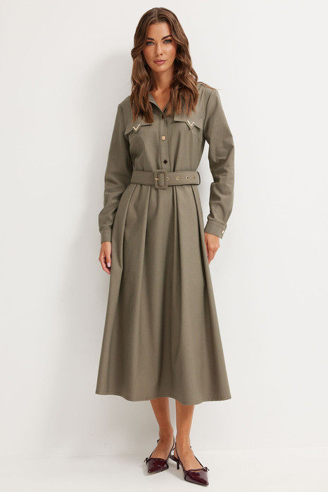 Платье прямого силуэта расширенное к низу из плательной ткани. Воротник рубашечного типа с застежкой по центру на петли и пуговицы. Платье отрезное по  линии талии. От подреза на талии вниз заложены декоративные складки. В боковых швах карманы. По переду на лифе нагрудные вытачки и декоративные клапаны. В комплект входит пояс из основной ткани. Обращаем ваше внимание, что фурнитура может отличаться от фото.