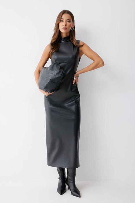 Платье прилегающего силуэта из экокожи длиной миди. Горловина-стойка. Спереди под грудью подрез, нагрудные и талиевые вытачки. На спинке в центральном шве потайная молния, по низу шлица. На спинке платья талиевые вытачки.