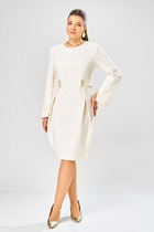 Элегантное платье полуприлегающего силуэта, с отрезной талией, на подкладке. Рукав втачной, по низу присборен на эластичную тесьму. Застежка по боковому шву на потайную молнию, а так же по спинке на пуговицу. Вырез горловины V-образный. Спереди платья имитация центральной застежки с пришивными пуговицами. Длина платья от плечевого шва 127см. Длина рукава 50см.