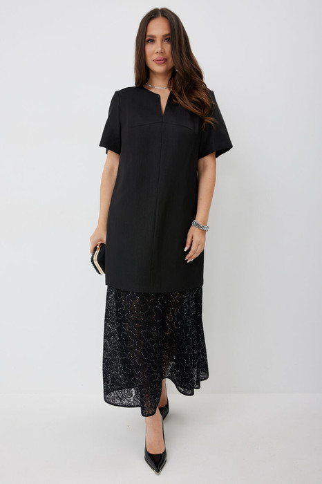 Элегантное платье свободного силуэта.  Платье представлено, как нижнее платье из нежной подкладочной ткани, дополненной по низу притачным воланом из красивого кружева с пайетками, и верхнего короткого платья-туники из гладкой костюмной ткани.  Застежка по спинке на потайную молнию.  Длина верхнего платья от плечевого шва 85см.  Длина рукава 25см.  Длина нижнего платья от плечевого шва 123см.