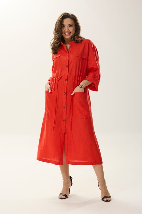 Платье свободного силуэта с застёжкой на пуговицы и кулисой в области талии. По переду кокетка с клапанами, накладные карманы. Воротник-стойка. Рукав 3/4 с застёжкой на пату.