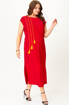 Платье в стиле бохо силуэта трапеция.Спинка со средним швом.По переду нагрудные вытачки и декоративная вышивка.Горловина слегка расширена, округлой формы. Рукав втачной ,3/4. Низ рукава подбирается патой с застёжкой на пуговицу. В боковых швах обработаны карманы.
