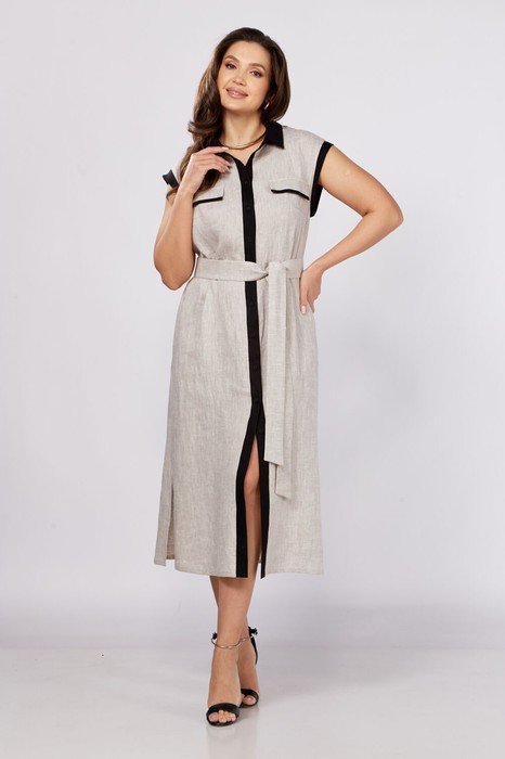 Платье прямого силуэта , слегка расширенное к низу. Спинка с отрезной кокеткой и бантовой складкой, выходящей из неё.Перед с центральной застёжкой на петли и пуговицы с планкой,обработанной из контрастной ткани,так же имеются нагрудные вытачки и клапаны с отделкой из контрастной ткани.В боковых швах обработаны карманы и разрезы.Плечо немного спущено. Пройма обработана отделочной деталью из контрастной ткани. Воротник с отрезной стойкой из контрастной ткани .Пояс из основной ткани .