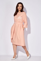 Спинка цельная, а передняя часть украшена нагрудными вытачками и левым рельефом с разрезом внизу. В рельеф вставлен декоративный волан-цветок из отделочной плиссеровки, который служит ярким акцентом и добавляет модели оригинальности. Длина платья — 7/8, что делает его универсальным для различных сезонов и ситуаций. По правой стороне расположен накладной карман — практичный элемент, дополняющий дизайн и удобство.