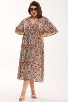 Платье выполнено из вискозного полотна, максимально комфортного и легкого. По переду v-образный вырез горловины  и накладной карман с декоративным нашивным элементом. Рукав одношовный, линия плеча слегка спущенная. Спинка разрезная по среднему шву, шов декорирован нашивным элементом. В комплект входит пояс. Длина платья 111 см. Длина рукава от горловины 34.