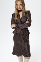 Платье прямого силуэта выполнено из атласа. Округлый вырез горловины. С левой стороны имеется разрез. Рукав цельнокроеный с отложной манжетой. Спинка со средним швом. Имеется съемный пояс. Длина по спинке-120 см, длина рукава –22 см.