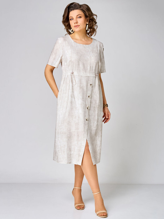 Платье женское прямого силуэта, вырез горловины округлый . Рукав втачной, одношовный. По левому рукаву по центру застрочена складка с пришитыми 3 пуговицами и авторской печатью. По переду чуть выше линии талии -подрез, талию можно фиксировать с помощью резинки и фиксатора. Нижняя часть платья по переду с ассиметричной складкой и 4 пуговицами. По бокам имеются карманы. По линии талии по спинке настрочена резинка для лучшего прилегания. К платью прилагается юбка-подъюбник  из трикотажной подкладки. Длина изделия по спинке -110см. Длина рукава -25 см