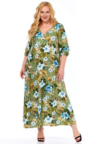 Платье женское А-силуэта длины миди. Отрезное по линии талии, на кулисе. Кокетка переда спинки из отделочной натуральной льняной ткани. Мужду кокеткой и лифом настрочено кружево. Лиф платья с застежкой на пуговицы и нависные петли. Карманы в боковых швай. Воротник стойка, рукав втачной со сборкой по окату, заканчивается воланом на резинке-венгерке. Платье на подкладке из хлопка с регулируемыми брителями.