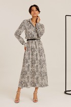 Платье полуприлегающего силуэта с V-образным вырезом. Перед и спинка со средним швом. В среднем шве спинки шлица. Карманы в боковых швах. Рукав «летучая мышь». Платье без ремня.