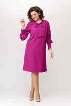 Платье полу прилегающего силуэта , расклешенное к низу, отрезное по линии талии со вставленным поясом на "венгерке". Рукав одношовный, втачной. Воротник плосколежащий, переходящий на спинке в рельефы, заканчивается бантом. Застежка на тесьму-молнию в среднем шве спинки до воротника.