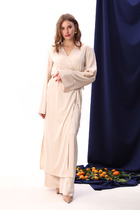 Платье женское полуприлегающего силуэта отрезное по линии талии. Лиф переда с нагрудными вытачками. Горловина V-образная. По среднему шву спинки сверху застёжка потайная молния. Юбка расклешённая. По линии талии эластичная тесьма резинка. Рукава одно шовные втачные. По окату рукава небольшие складки, низ со сборками. Украшает платье кружево. Изделие дополняет пояс кушак. Платье без подкладки.
