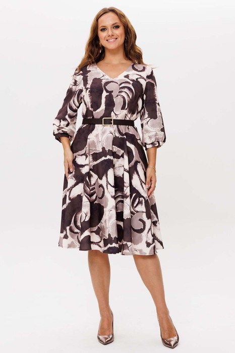 Платье женское полуприлегающего силуэта отрезное по линии талии. Лиф переда с нагрудными и талевыми вытачками. Горловина V-образная. По среднему шву спинки сверху застёжка потайная молния. Юбка расклешённая. Рукава одно шовные втачные, по низу рукава манжета, по окату в области плеча небольшая сборка. Изделие дополняет ремень. Платье без подкладки.