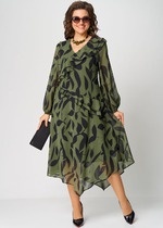 Платье женское полуприлегающего силуэта отрезное по линии талии. Лиф переда с нагрудными и талевыми вытачками. Горловина круглая. По среднему шву спинки сверху застёжка потайная молния. Юбка расклешённая. Рукав одношовный втачной. Низ рукава со складками. Изделие дополняет пояс кушак. Платье без подкладки.