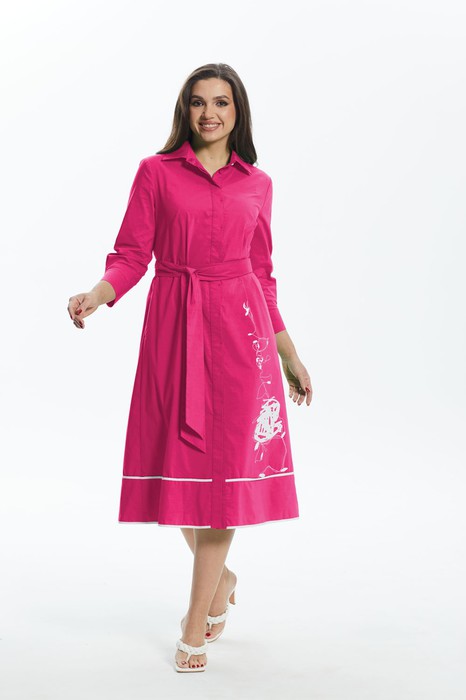 Женское платье – рубашка свободного силуэта выполнено из хлопко содержащей ткани. По переду нагрудные вытачки, потайная застёжка на прорезные петли и пуговицы, декоративная печать. По спинке кокетка и две небольшие складки. Воротник отложной на стойке. Рукава одношовные втачные на манжете. Горизонтальный подрез по низу платья и низ платья обработан контрастным кантом. В боковых швах функциональные карманы. Платье без подкладки. Дополнением служит пояс.