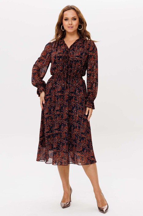 Платье женское свободного силуэта, отрезное по линии талии, расклешённое к низу, выполнено из ткани шифон. По линии талии сборка на резинку «венгерку». Горловина v-образная с небольших рюшей по переду до линии талии на завязках. Рукава одно шовные втачные, по низу сборка на резинку «венгерку». Платье на тонкой трикотажной подкладке.
